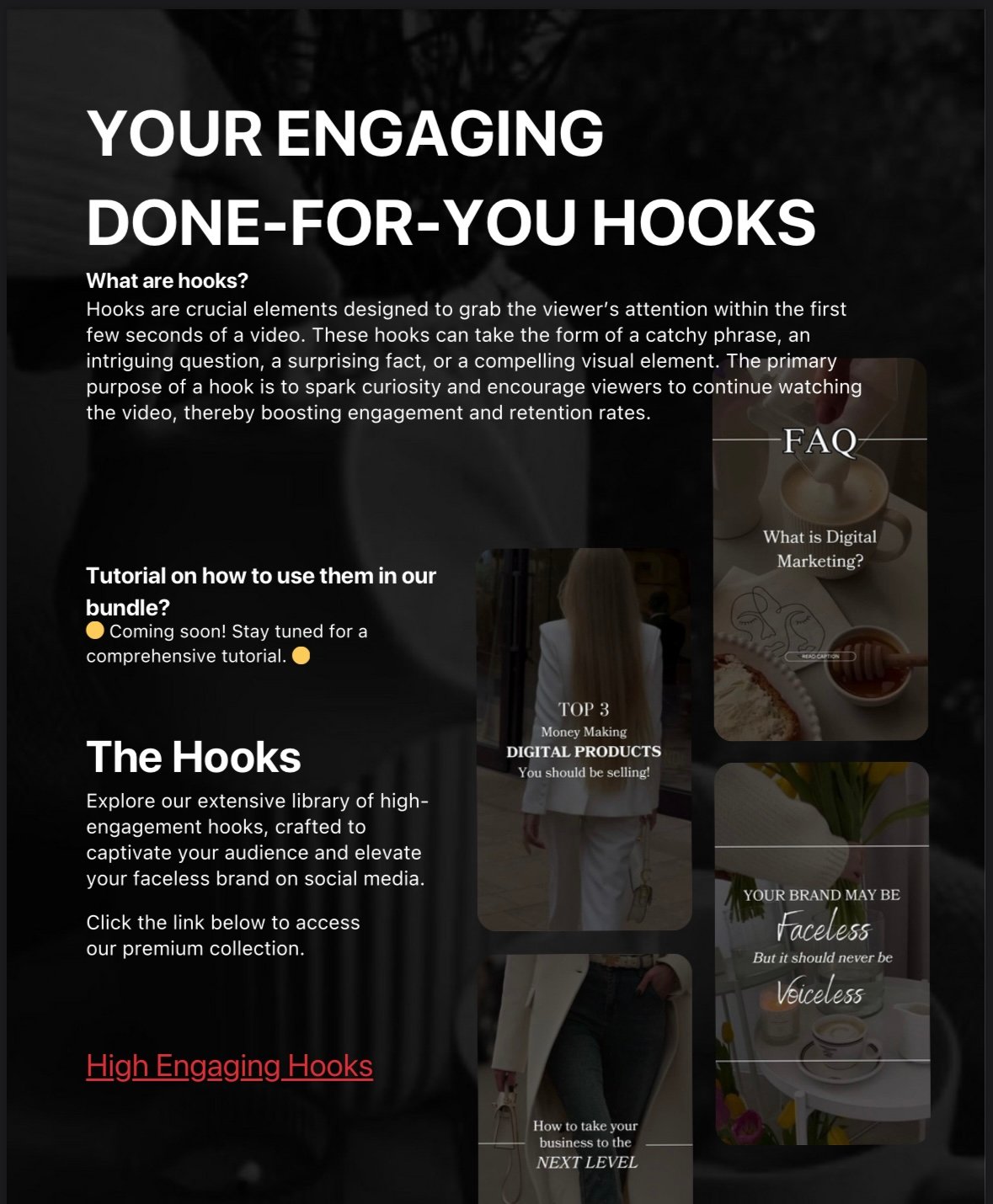 - 📈 20,000+ Viral Hooks & Templates – Proven hooks, calls to action and Canva templates ready to plug into your content – including master resell rights.
